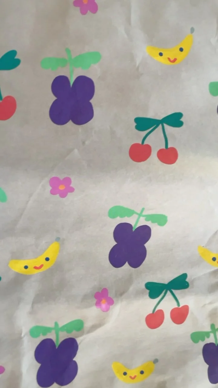 Piirrosvihreitä kirsikoita violetilla varrella ja lehdillä.