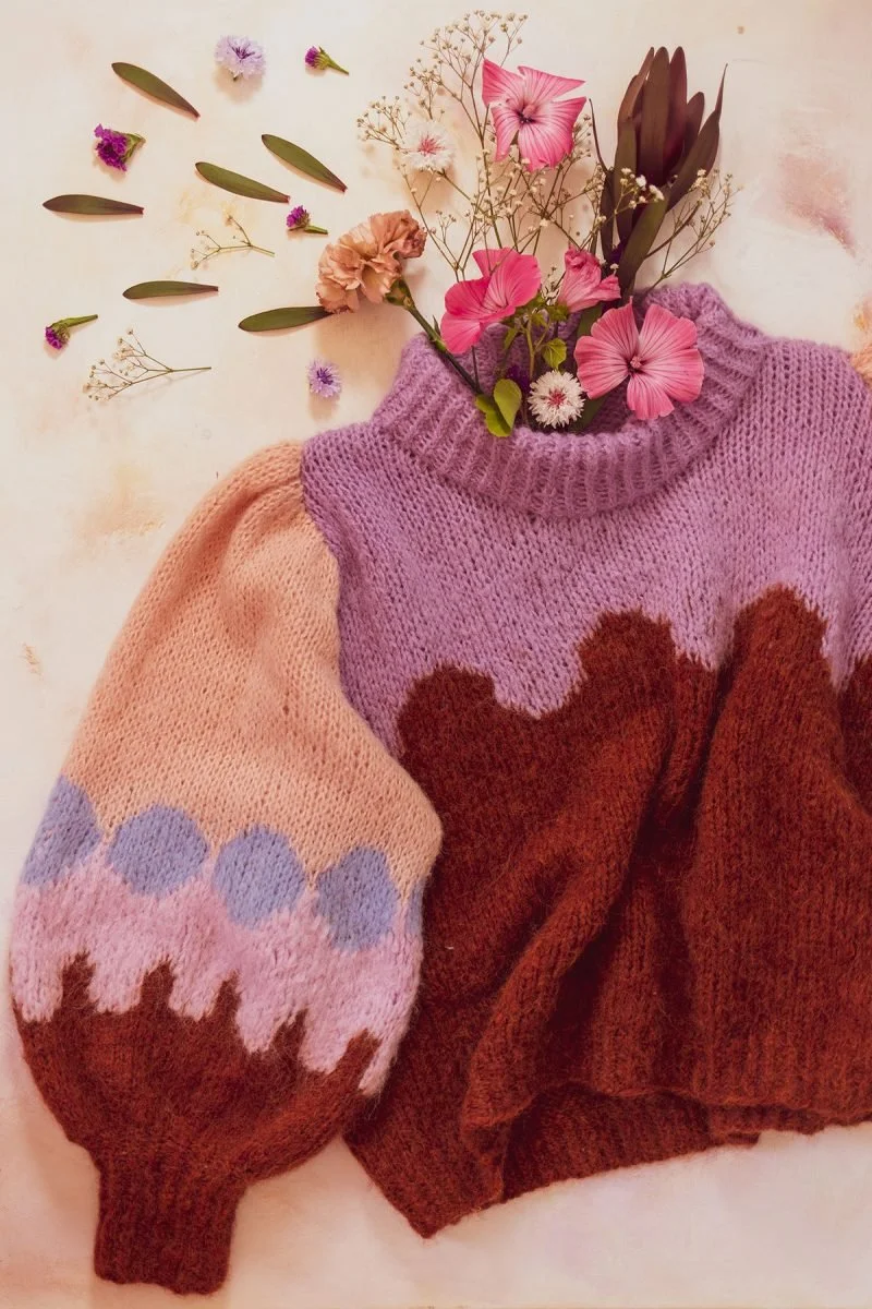 Väreiksi valikoituneet ruskea, laventeli, hailakka vaaleanpunainen, liilan ja vaaleanpunaisen sekoitus ja kesätaivaan sininen ovat jotenkin ihan älyttömän upea yhdistelmä. Tykkään myös paljon, kun neule on yhdistetty tuohon Kaikon hameeseen (joka saatu pr-lahjana), joka on eri ruskean sävy kuin neuleessa.