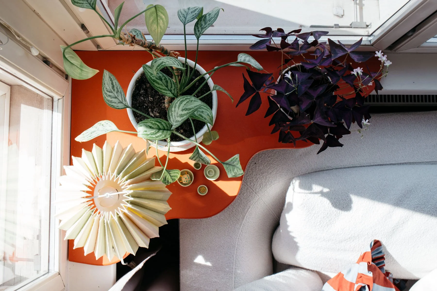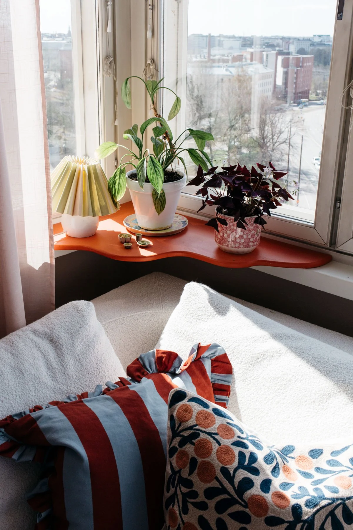 Sain idean nurkkaikkunalaudasta enkä meinannut pysyä housuissani, kun niiiiiiiiin hyvä idea jostain vain tulla tupsahti. Taso pysyy paikoillaan ilman mitään kiinnittämistä, koska kiinteät ikkunalaudat ovat sopivan leveät kannattelemaan kukkaruukuista painavaa hyllylevyä.